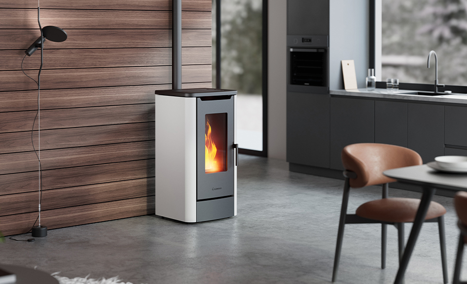 Poêle à pellets à convection naturelle, ventilé et canalisé. Puissance thermique: 3,1 - 6,6 kW.